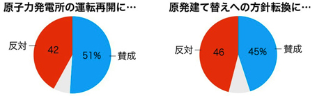 朝日新聞の調査で、停止している原発の運転再開に賛成51%反対42%、原発建て替えに賛成45%反対46%と、あの朝日新聞にして驚きの結果が出た。これまでは賛成が3割、反対が6割ほどだったから青天の霹靂と云える。昨今の料金値上げが大きな要因だろうが「背に腹は代えられない」というところか !?