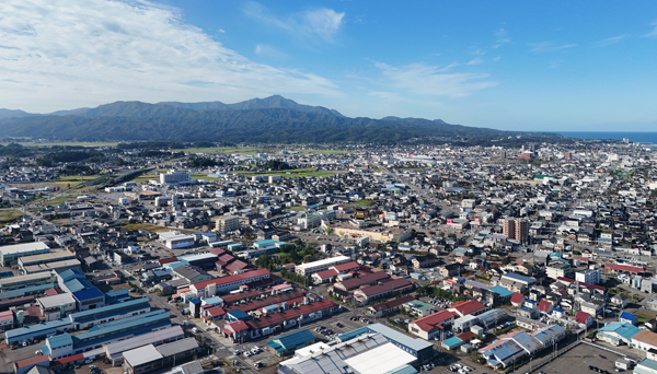 知り合いが、わが家の真上から米山方向をドローン撮影。海抜6m中央海岸まで約4km。津波は心配なさそうだが、地盤が悪く地震が怖い。