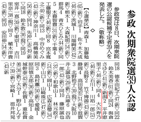 いやはやビックリ。参政党の公認候補者の中に姪の名前を発見。家の前の空き地に立派な掲示板を作り、党のポスターやのぼりを掲示して熱心に応援していたが、まさか公認候補、それも比例区ではなく選挙区候補として名前が載るとは、おどろ木 桃の木 山椒の木 当り来 車力の 車曳き !!!