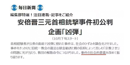 安倍首相銃撃事件の裁判員裁判の初公判が奈良地裁で始まることから、毎日新聞は「事件の社会的意義を振り返る」と連載企画の告知で事件に意義があったような表記をした。当然、抗議殺到で「社会に与えた影響」と訂正文の載せたが、しかし文章のプロがこんな書き間違いをする訳がない。会社を挙げて安倍殺人事件に社会的意義をおもんばかっていたのだろう。新聞とテレビ現場の思いあがり、経営者のパワハラ、こんなメディアに実事求是を求める方が間違っている。