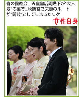 華やかな秋の園遊会が終わったが、春の時はちょっとした騒動?があったようで、週刊「女性自身」が記事にしていた。