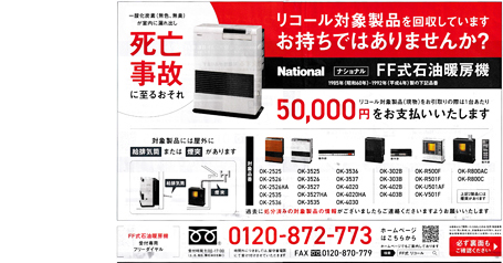 松下電工やPanasonicから販売された暖房器のリコール案内がまた折り込みで入ってきた。数年前からテレビCMや新聞、チラシで大々的に告知しているが、いったいいくら掛かったのだろう。いずれも中国生産のFF石油ストーブやホットカーペット、それに電動自転車用の大型バッテリーに発火の恐れがあって火災事故も発生しているようだ。「安かろう 悪かろう」が随分と高くついた筈。食品はもちろん、火災が不安の中国製には手を出さないに限る。