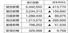 新聞購読者数の購読者数の減少が続いている。特にトップの読売新聞は編集方針が変わったのか、自民党と同じく岩盤保守層が離れているようだ。読売はピーク時(2001年)は1,031万部だったがことし11月には537万部まで落ちた。