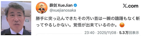 高市首相「中国が軍艦などで台湾を海上封鎖しこれを解こうと米軍への武力行使があった場合は日本の存立危機事態になり得るケースだと考える」と国会答弁をした。これに中国は内政干渉として反発し撤回を要求。自国民に日本渡航の自粛を勧告する対日嫌がらせに出た。しかも常軌を逸した駐大阪総領事の「高市斬首」発言は全く無視。これに一部の野党とマスゴミ、専門家は中国に加担しているが、高市支持率はむしろ上がっている。毅然と対峙する姿勢に拍手しているのだ。中国は強い日本が怖い。だから過剰反応をする。これからも中国が嫌がることをどんどんやればいい。高市早苗は「鉄の女」になり始めた !! それにしても日本のマスゴミは中国の言いなりで、連日、高市非難に勤しむ。情けない。